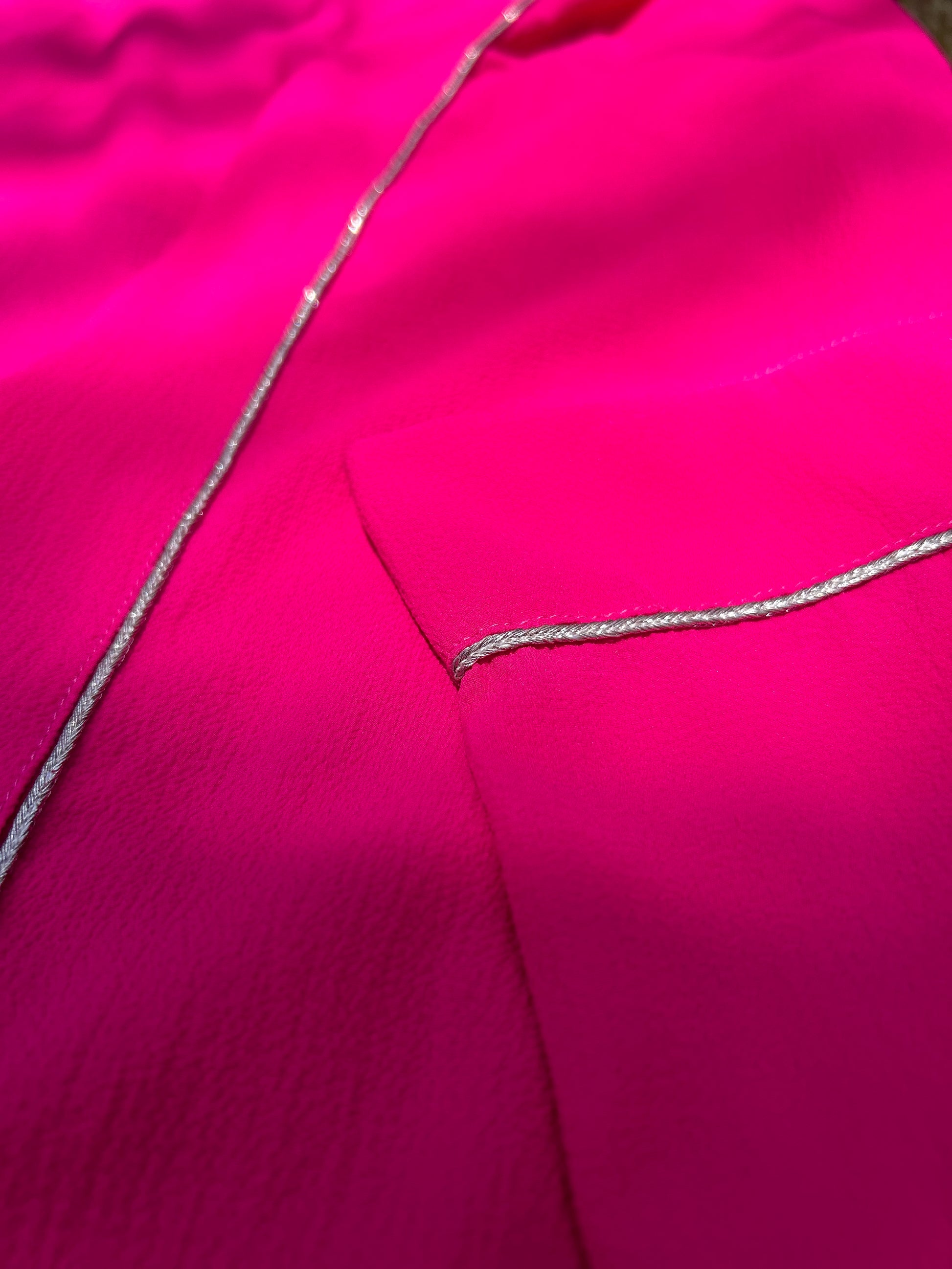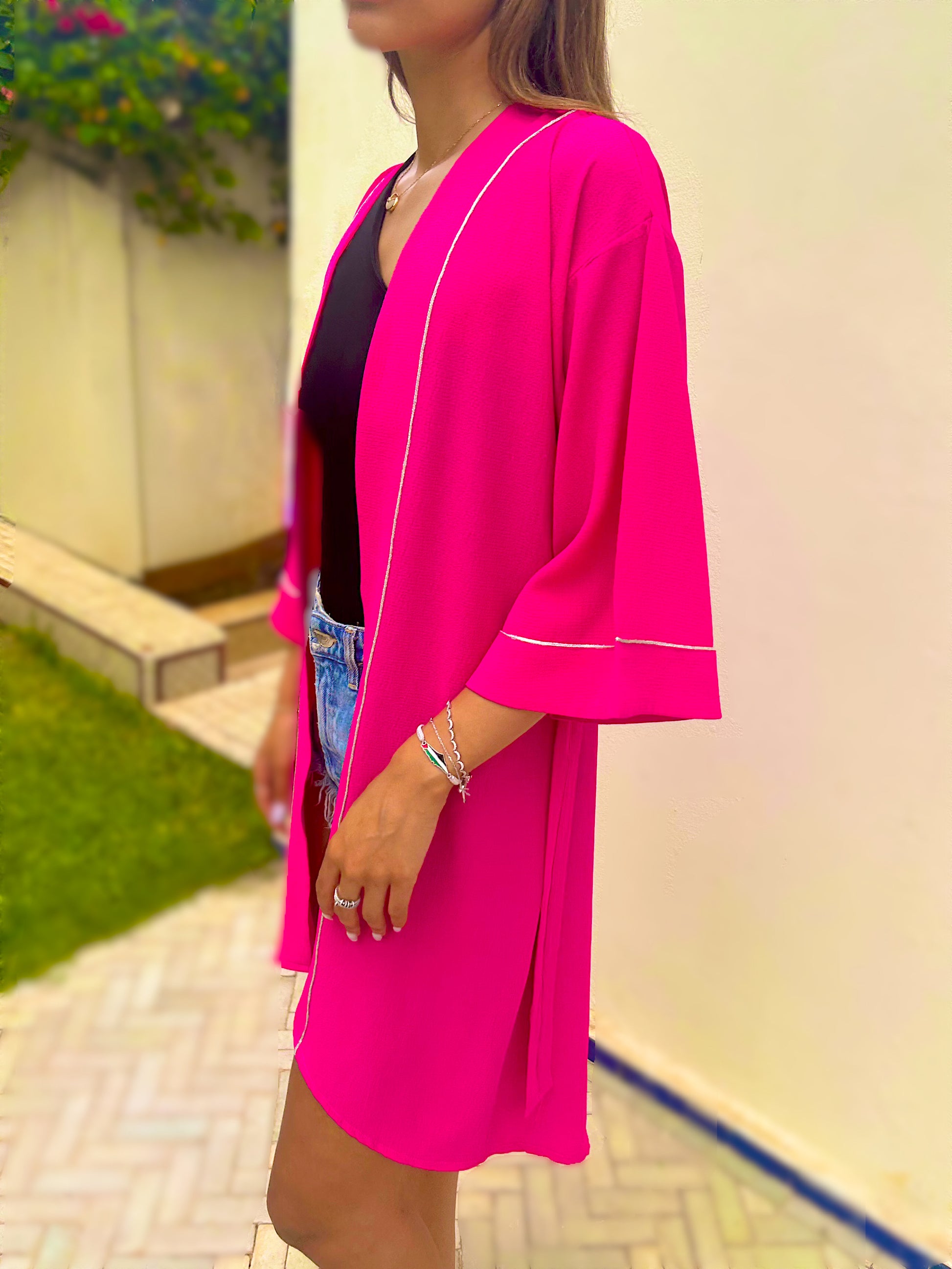 Le kimono “AURA” se décline en bleu minuit raffiné, confectionné dans un crêpe fluide qui accompagne le mouvement. Sa coupe épurée est sublimée par un kitane doré, clin d’œil aux finitions beldi revisitées.