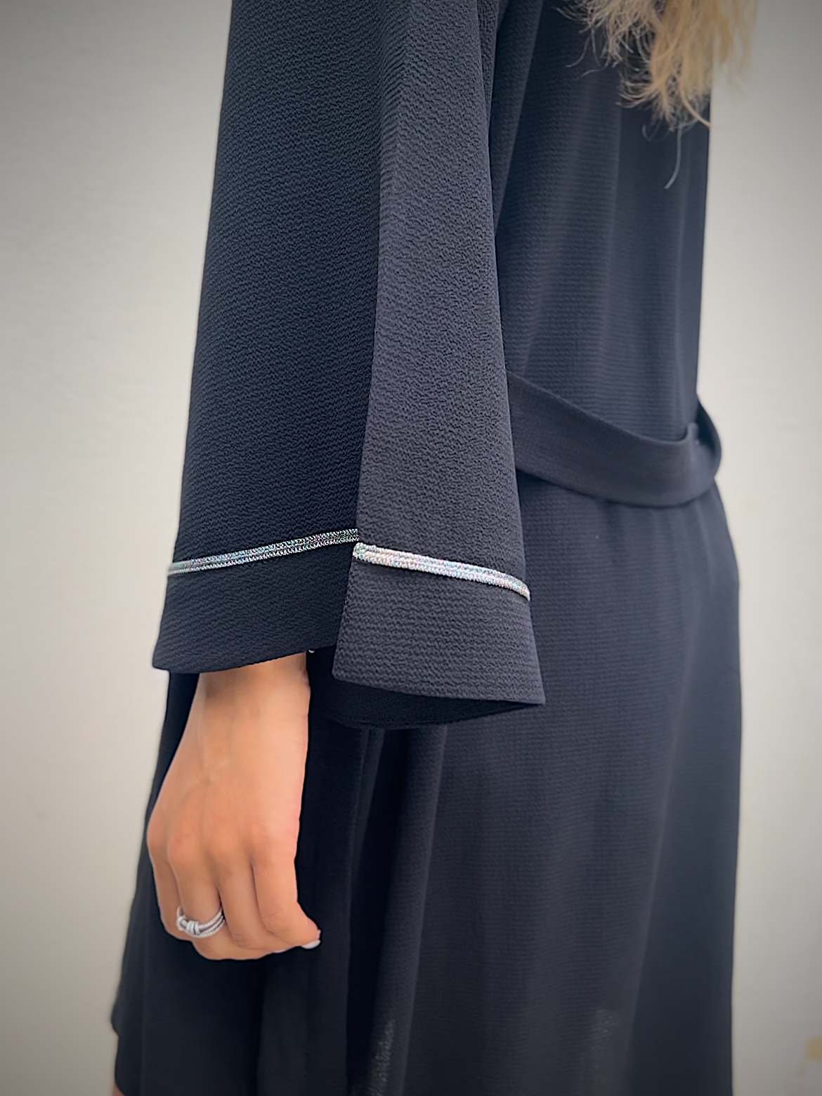 Le kimono AURA en noir profond reflète une allure minimaliste, pensée pour celles qui savent que la simplicité est une force.