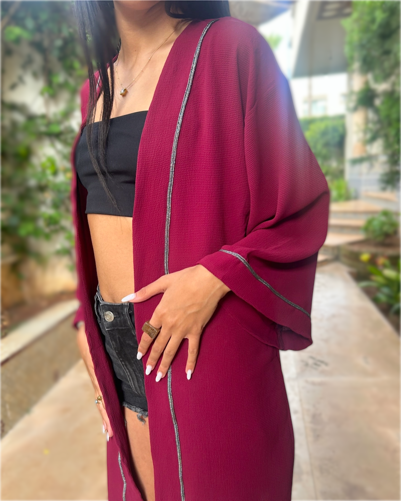Un kimono fluide et texturé, dans une teinte prune profonde.